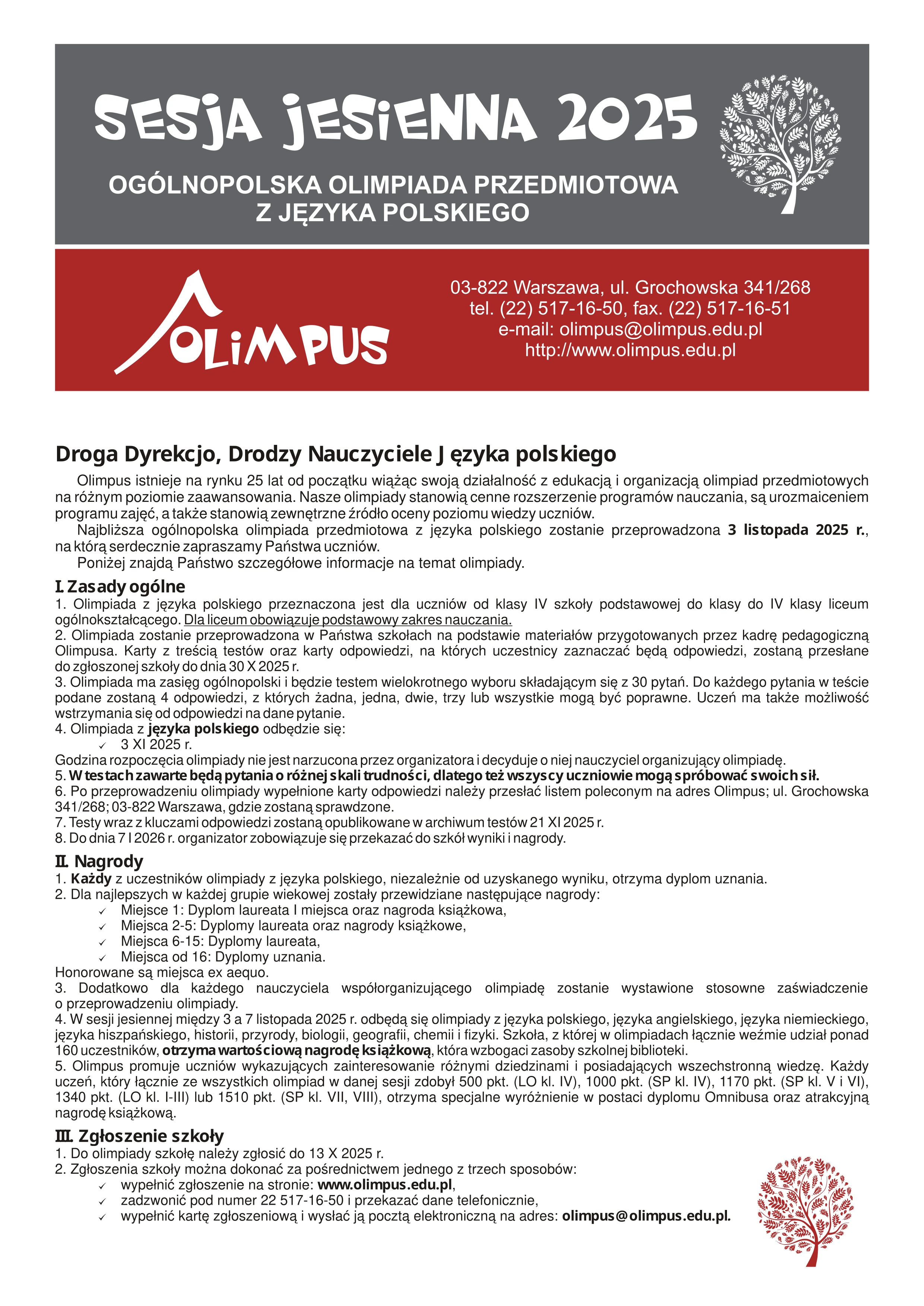 Olimpiada Olimpus w sesji jesiennej z języka polskiego przeznaczona jest dla uczniów klas IV-VIII szkoły podstawowej oraz I-IV liceum ogólnokształcącego i ma zasięg ogólnopolski. Test olimpiady składa się z 30 pytań i podanych do nich 4 odpowiedzi. W testach z sesji jesiennej jedna odpowiedź, dwie, trzy lub wszystkie mogą być poprawne. Także może zdarzyć się tak, że żadna z odpowiedzi nie będzie poprawna.