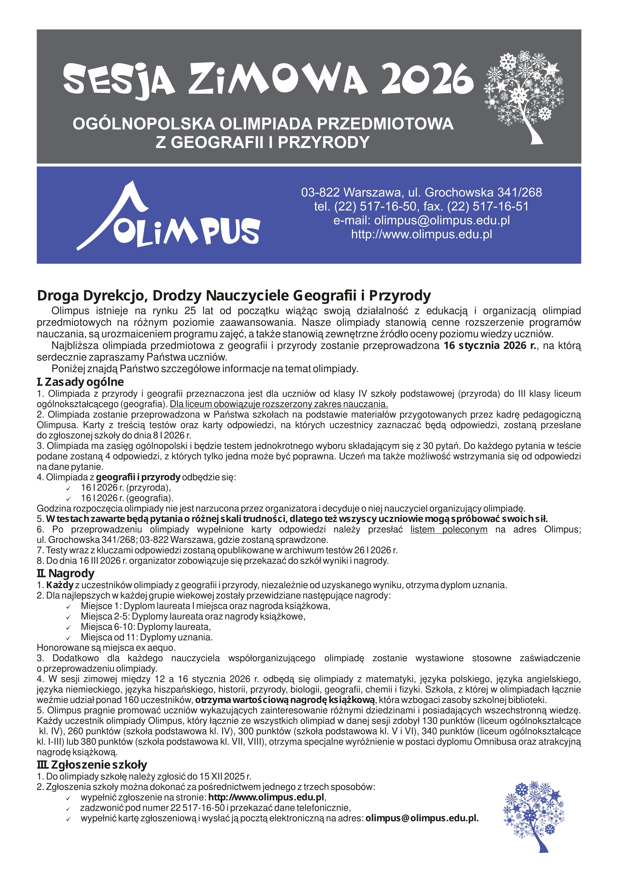 Olimpiada Olimpus w sesji zimowej z geografii przeznaczona jest dla uczniów klas V-VIII szkoły podstawowej oraz I-III liceum ogólnokształcącego i ma zasięg ogólnopolski. Test olimpiady składa się z 30 pytań i podanych do nich 4 odpowiedzi. W testach z sesji zimowej tylko jedna z podanych odpowiedzi może być poprawna.